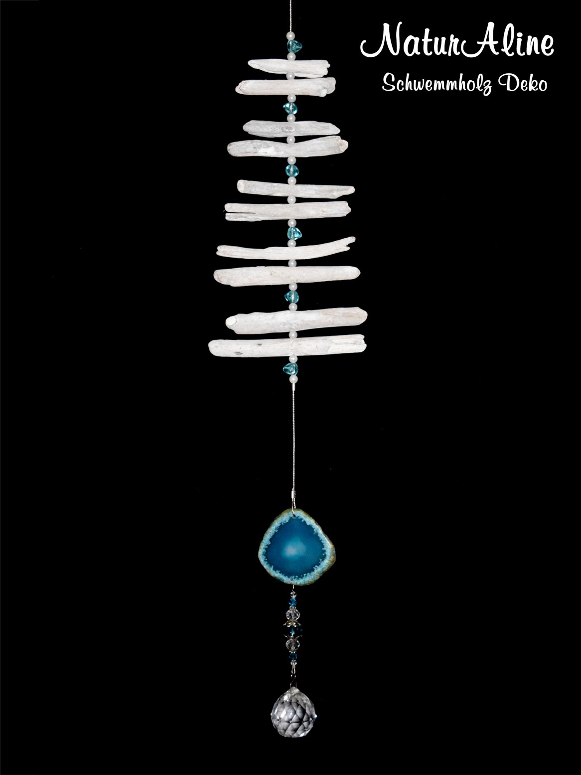 Schwemmholz Girlande „Ozeanleuchten“ mit blauem Achat und Glaskugel im Kristalldesign.