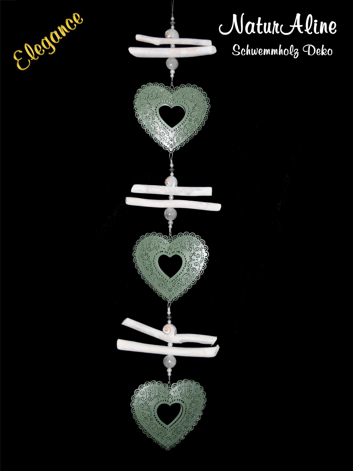 Die Schwemmholz Girlande Elegance 763, passt aufgrund ihrer Länge von 75 cm an jedes Fenster oder in jeden Raum. Sie besteht hauptsächlich aus 3 grünen, mit Ornamenten bestanzten Metallherzen, 3 wunderschön geschliffenen und polierten Schneckenhäuser der Art “Turbo fluctuosa” und ebenfalls 3 handgefertigten Tonperlen.