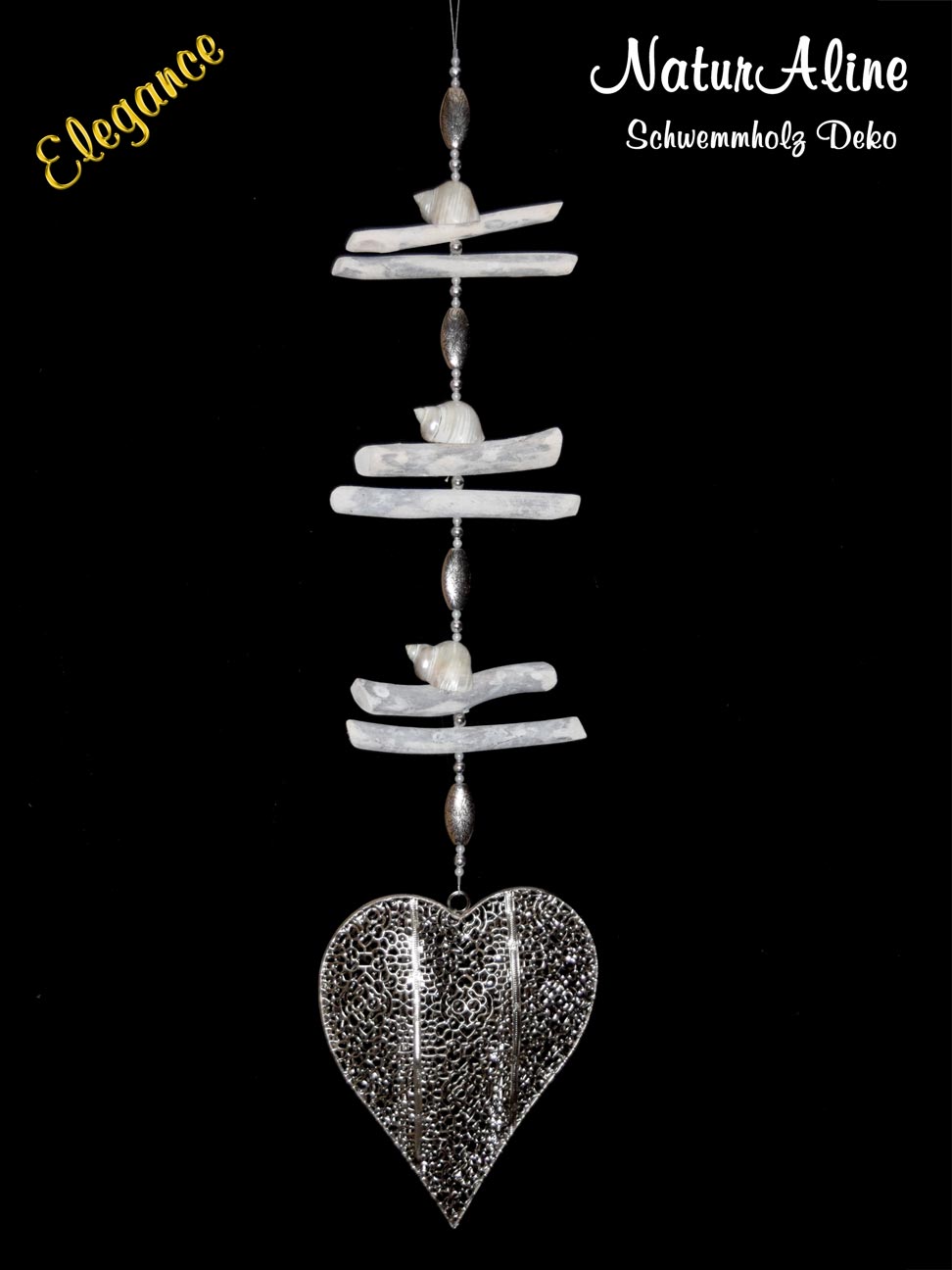 Die Schwemmholz Girlande Elegance 876, besteht aus einem tollen silberfarbenen Metallherz und diversen Deko Materialien. Besonders bemerkenswert sind jedoch die 3 wunderschönen Schneckenhäuser der Art “Turbo fluctuosa”.