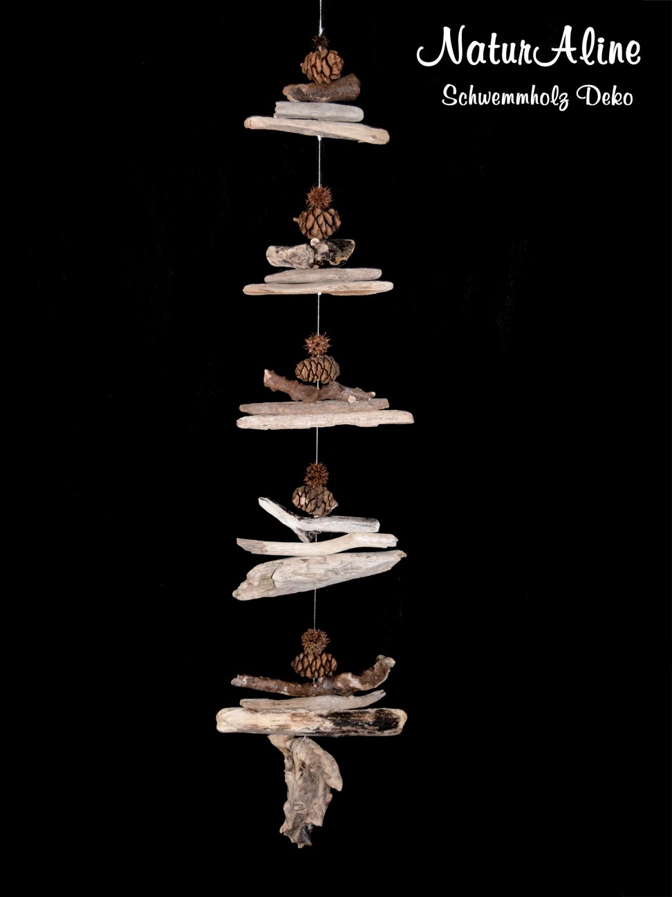 Die Schwemmholz Girlande Natur Pur 493, besteht ausschliesslich aus Naturmaterialien. Einzig auf das rostfreie Drahtseil wollten wir nicht verzichten. Nur so kann die Girlande auch an Orten mit erhöhter Feuchtigkeit verwendet werden. Neben den Hölzern sind auch noch 5 der seltenen Mammutbaum Tannenzapfen eingearbeitet.