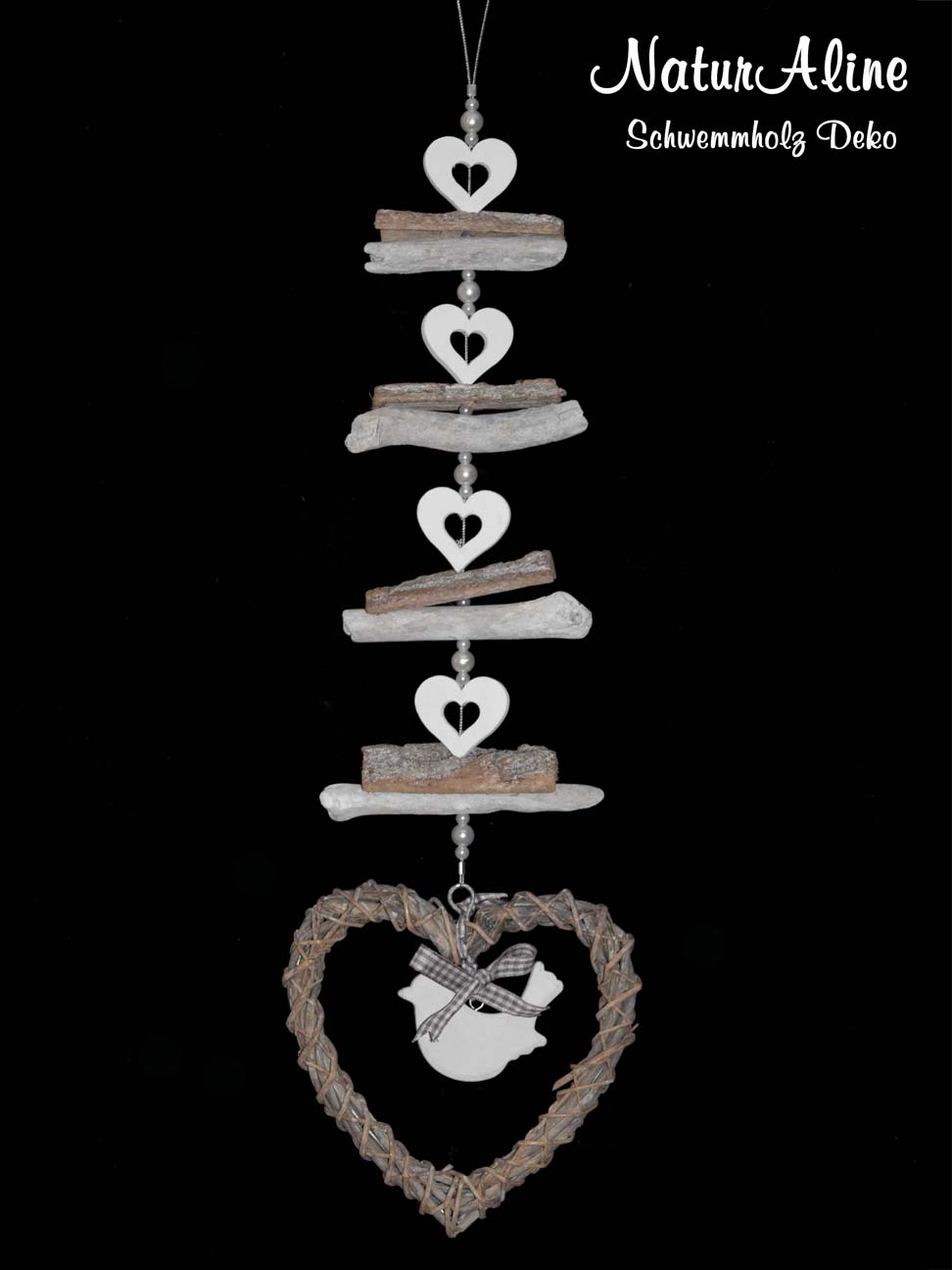 Zaubern Sie mit unserer liebevoll gestalteten Schwemmholz Girlande eine romantische Atmosphäre in Ihr Zuhause. Diese kunstvolle Komposition aus natürlichen Schwemmholzstücken und filigranen weißen Herzchen wird durch ein großes Rattanherz abgerundet, das auch noch mit einer weissen Taube verziert ist. Die perfekte Dekoration für besondere Anlässe oder als ständiges Dekor, das natürliche Schönheit und Zärtlichkeit in jeden Raum bringt. Das Schleifchen kann übrigens auch entfernt werden.